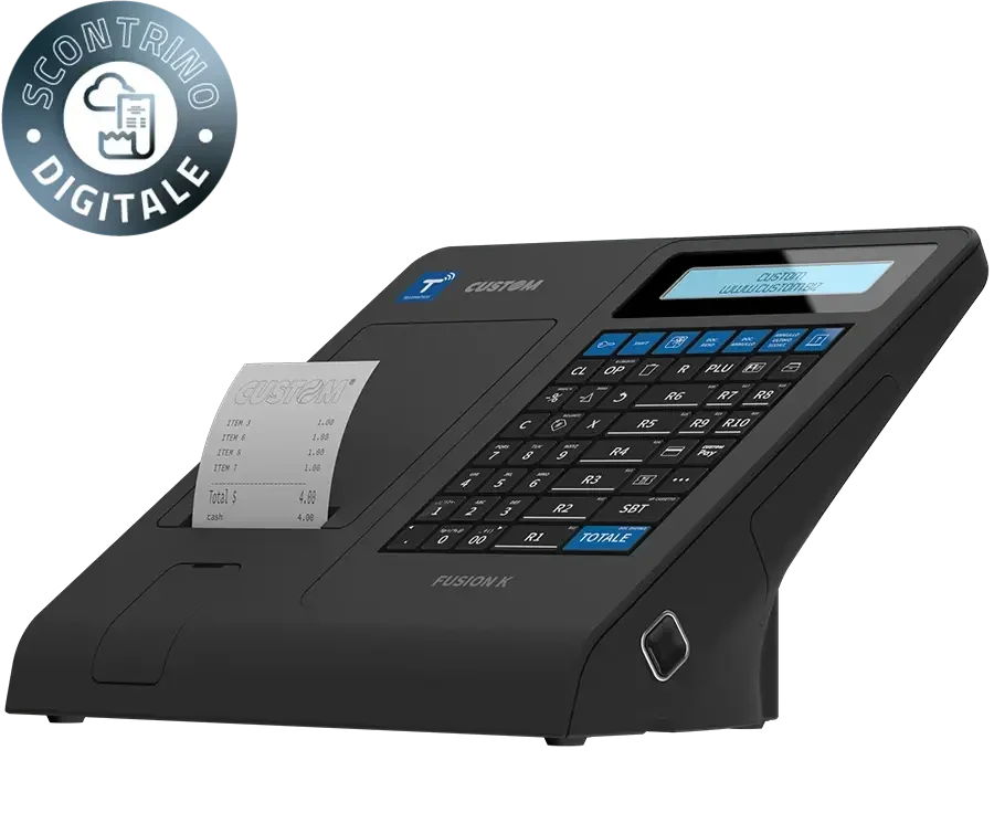 FUSION K è il nuovo registratore telematico Custom che unisce l’ ergonomia del modello FUSION a una tastiera meccanica precisa e affidabile, con la possibilità di pre-settare ogni funzione necessaria ai negozi moderni. FUSION K adotta una stampante integrata 80 mm con caricamento carta facilitato, per emettere velocemente documenti commerciali dettagliati. I due ampi display cliente/operatore garantiscono un’elevata visibilità delle transazioni e dei messaggi promozionali.